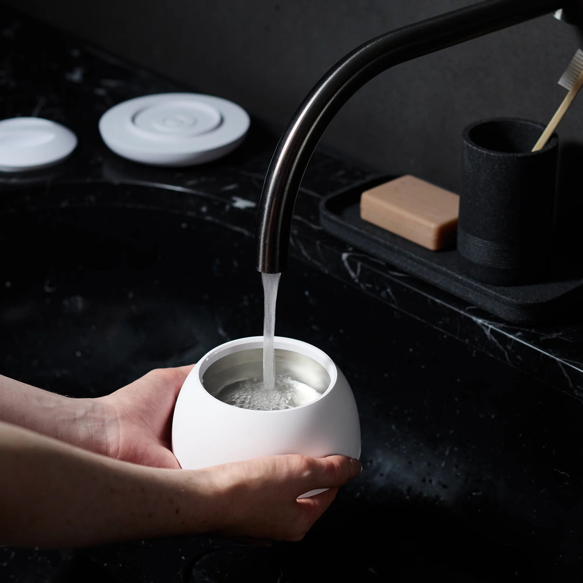 Plug the base in. Pick up the tank from the base, remove the lid and fill the tank with water under the tap.